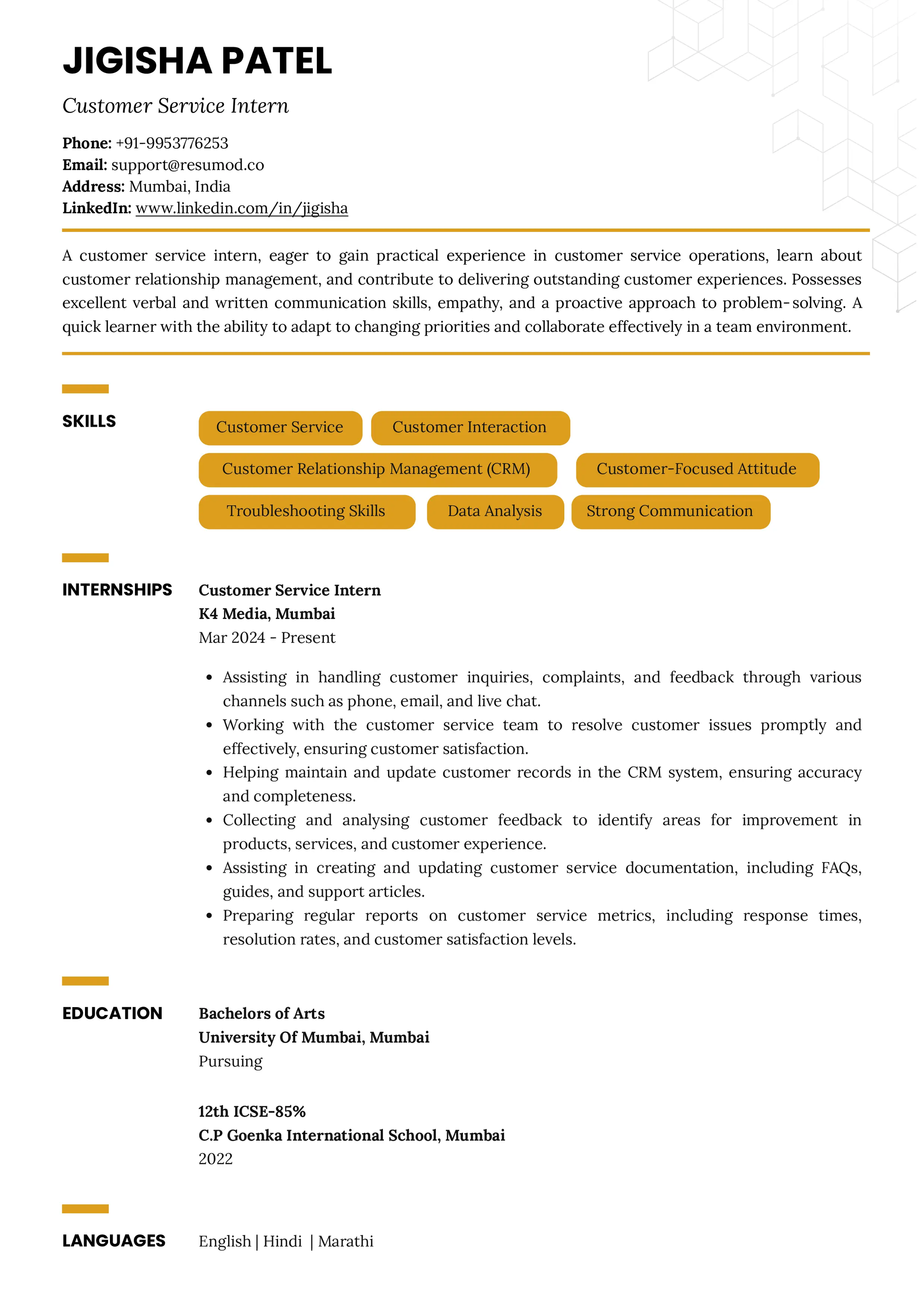 - The resume clearly positions the candidate in customer service, with hands-on experience in handling queries, CRM updates, and customer interactions.