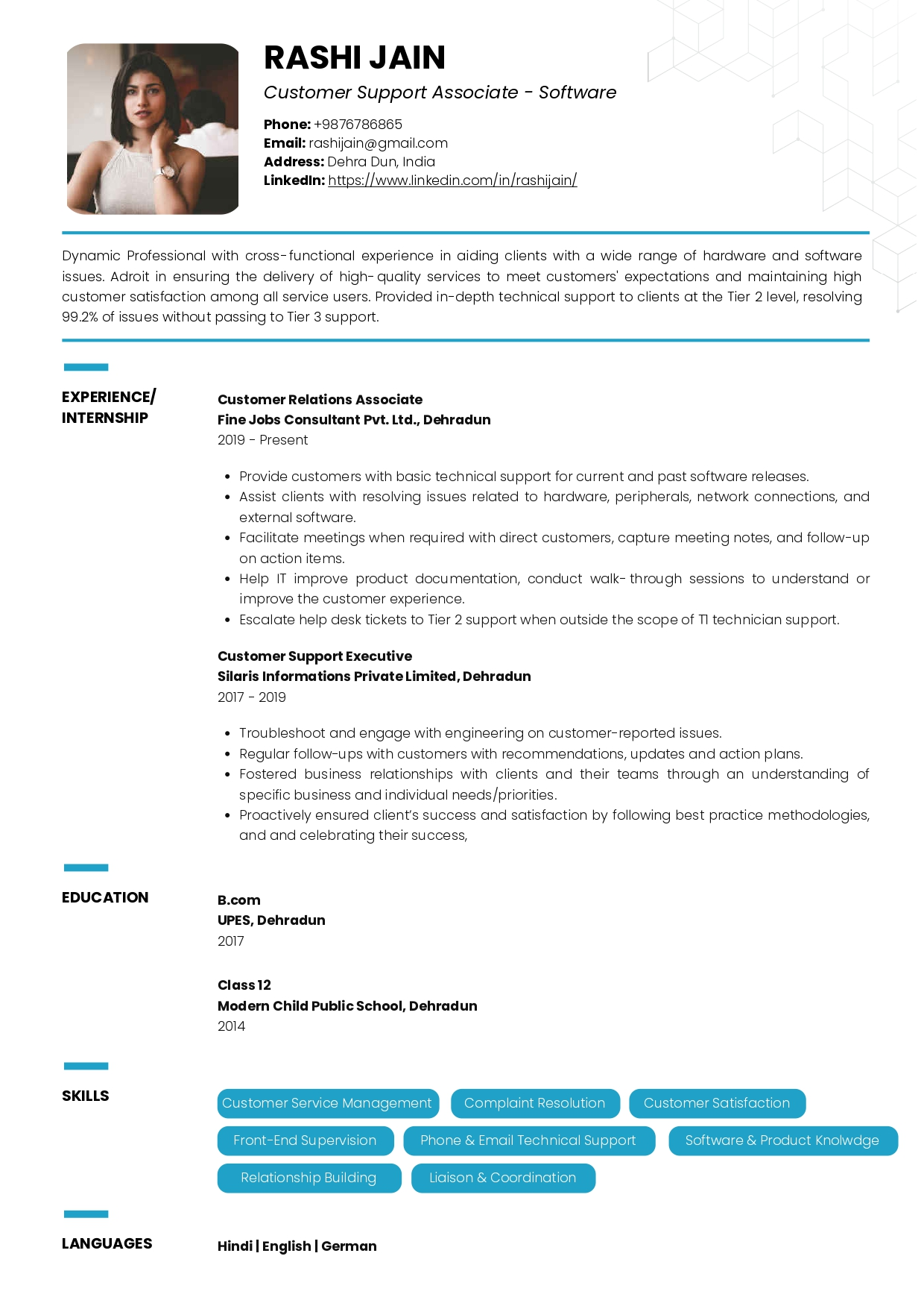 - The resume shows strong experience in technical customer support, with clear progression from handling issues to managing client relationships.