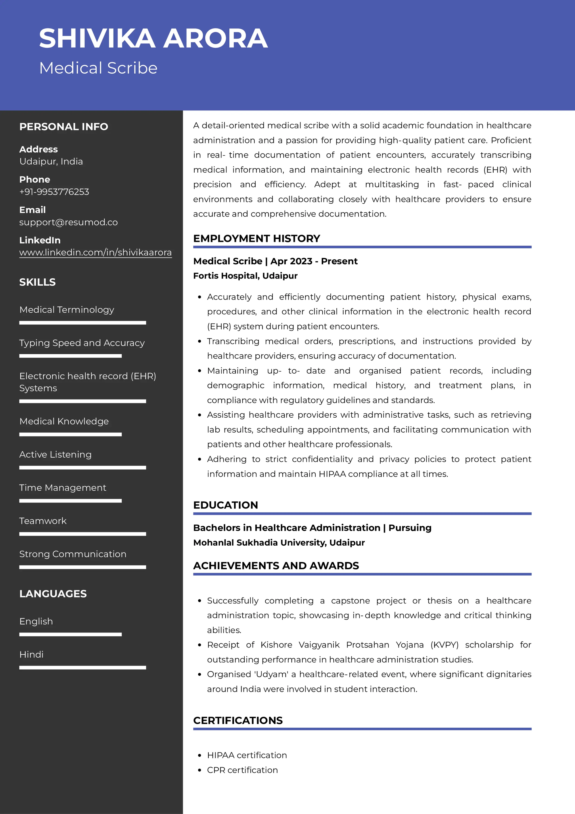 Resume of Medical Scribe