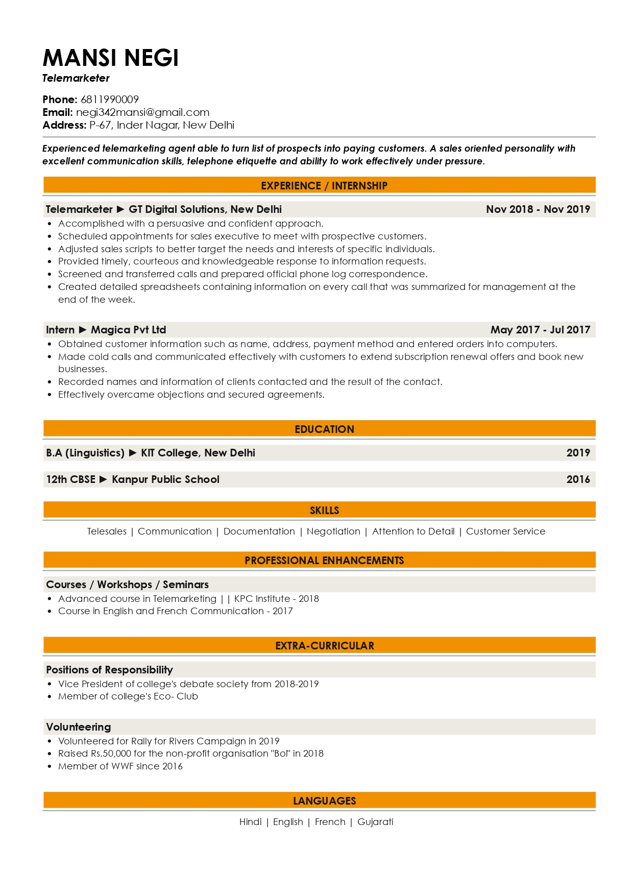 Check the full resume of Telemarketer in text format here.