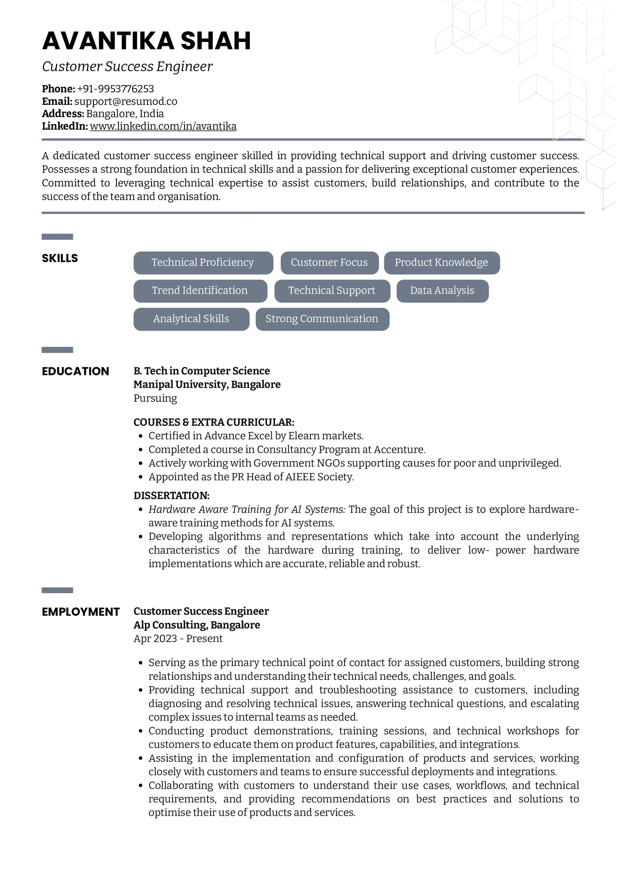 - It highlights hands-on experience in troubleshooting, product implementation, and client interaction, making the profile practical and impact-driven.