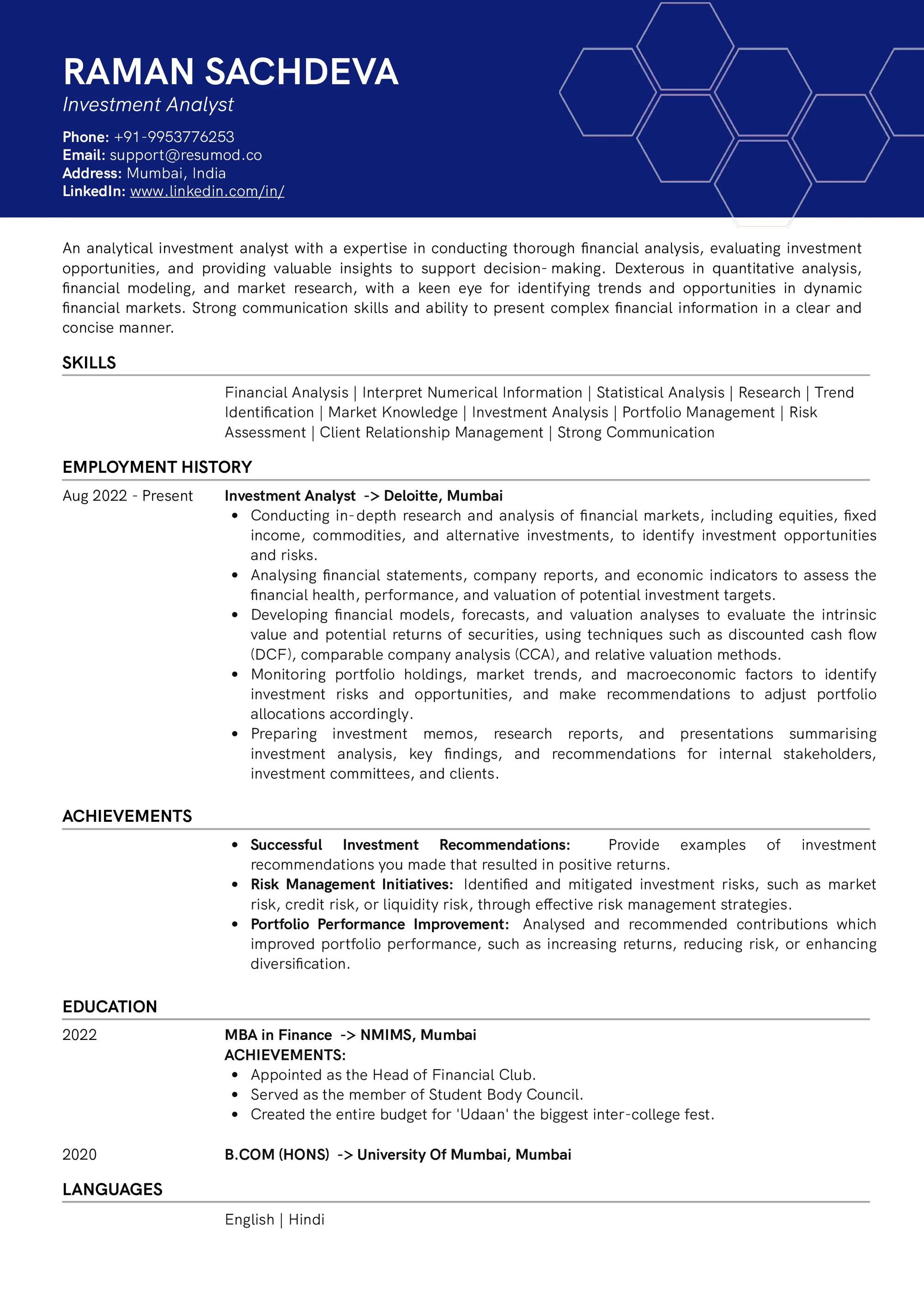 - Strong analyst-focused summary, clearly highlighting expertise in financial modelling, valuation techniques, and market research.